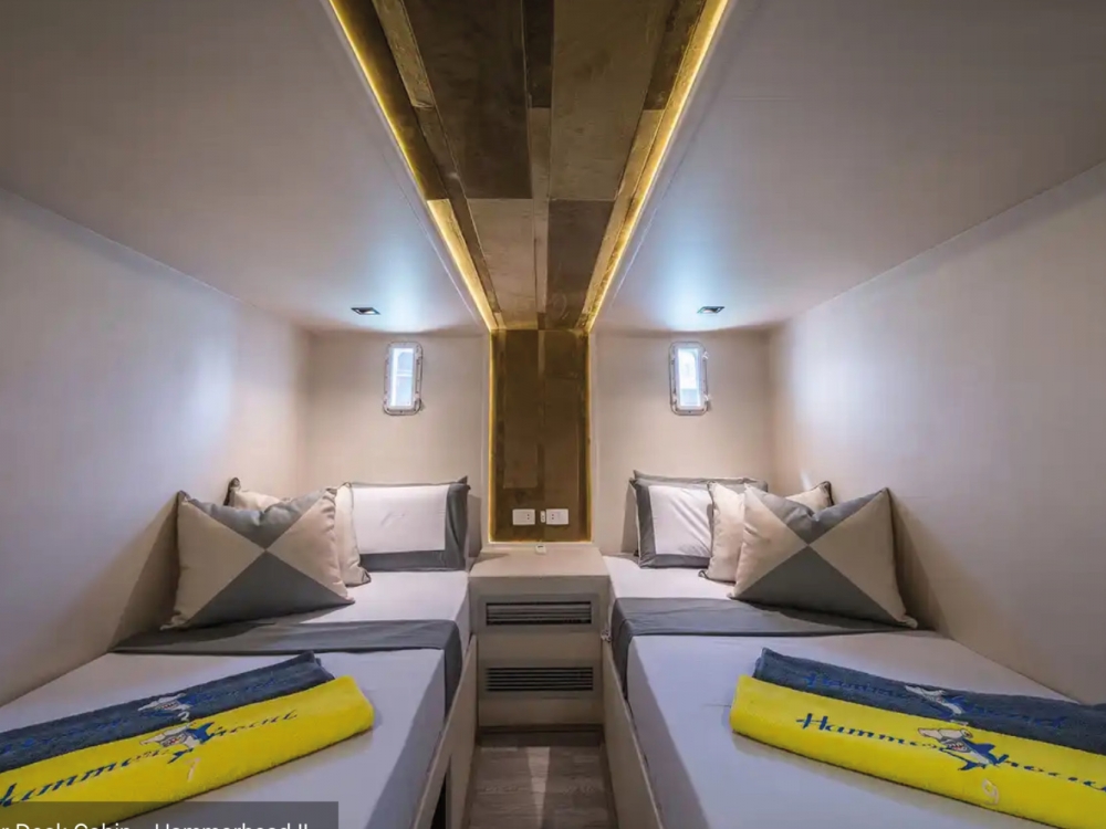 Le Hammerhead II est un superbe bateau de 43 mètres, alliant élégance moderne, confort et fonctionnalité pour offrir une expérience de croisière plongée inoubliable en mer Rouge. Il dispose de 16 cabines climatisées, certaines avec salle de bain privative, pouvant accueillir jusqu’à 32 passagers dans un cadre raffiné et convivial. Les espaces communs ont été pensés pour la détente : un salon-restaurant lumineux avec de larges fenêtres panoramiques permet de savourer les repas tout en admirant les paysages, tandis que les ponts supérieurs offrent de vastes espaces solarium, un jacuzzi et un mini-bar pour se relaxer après les plongées.