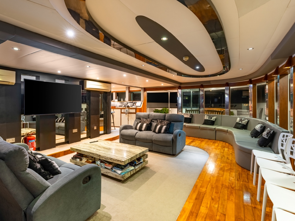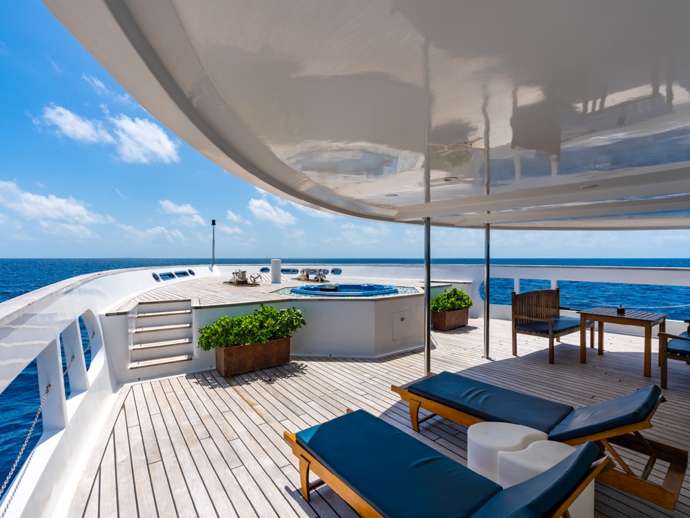 Les espaces communs sont conçus pour la détente et la convivialité. Le salon intérieur lumineux dispose d’un grand écran TV idéal pour visionner vos images sous-marines ou un film en soirée, tandis que le salon extérieur et son bar permettent de profiter de la vue et d’un rafraîchissement en toute tranquillité. Pour les amateurs de soleil, de vastes ponts solarium sont à disposition afin de savourer pleinement la douceur du climat maldivien.