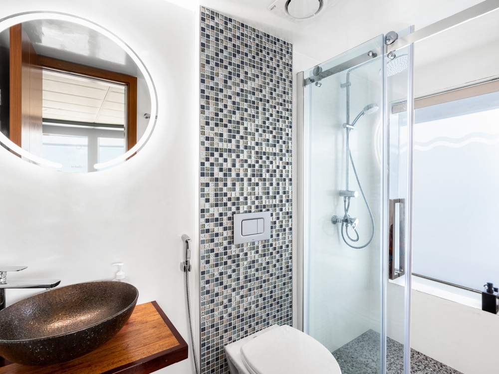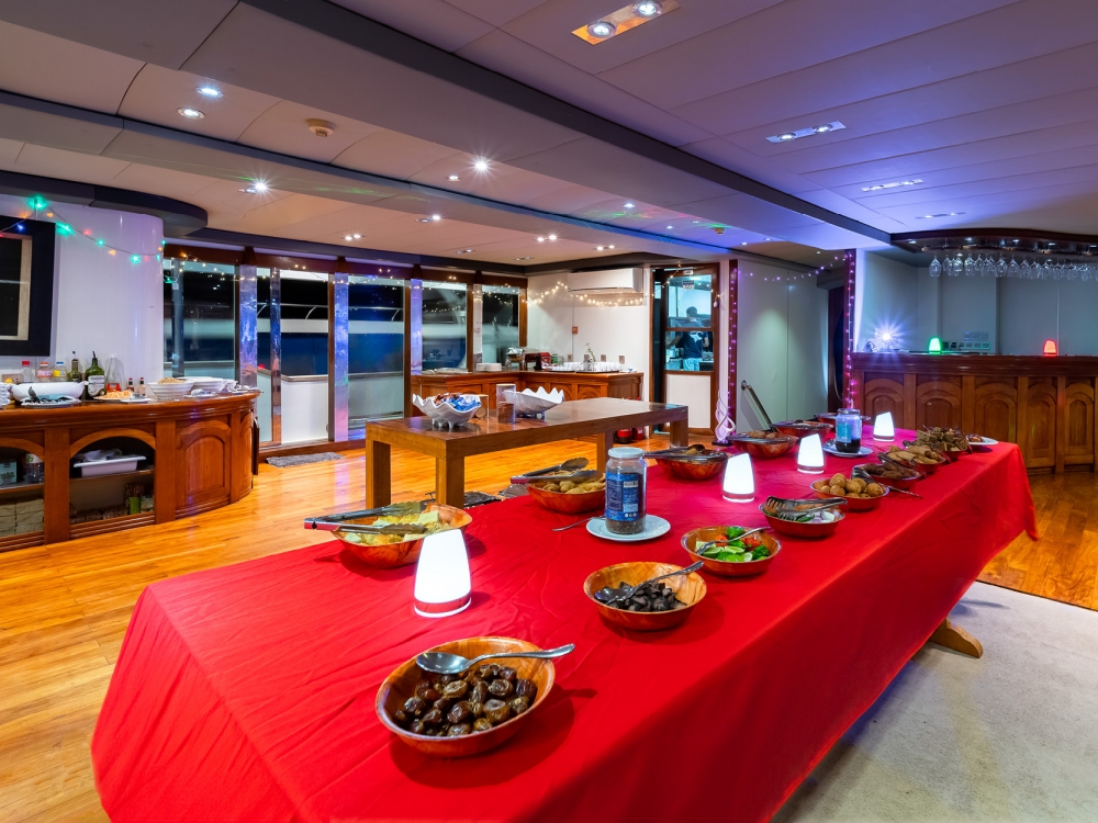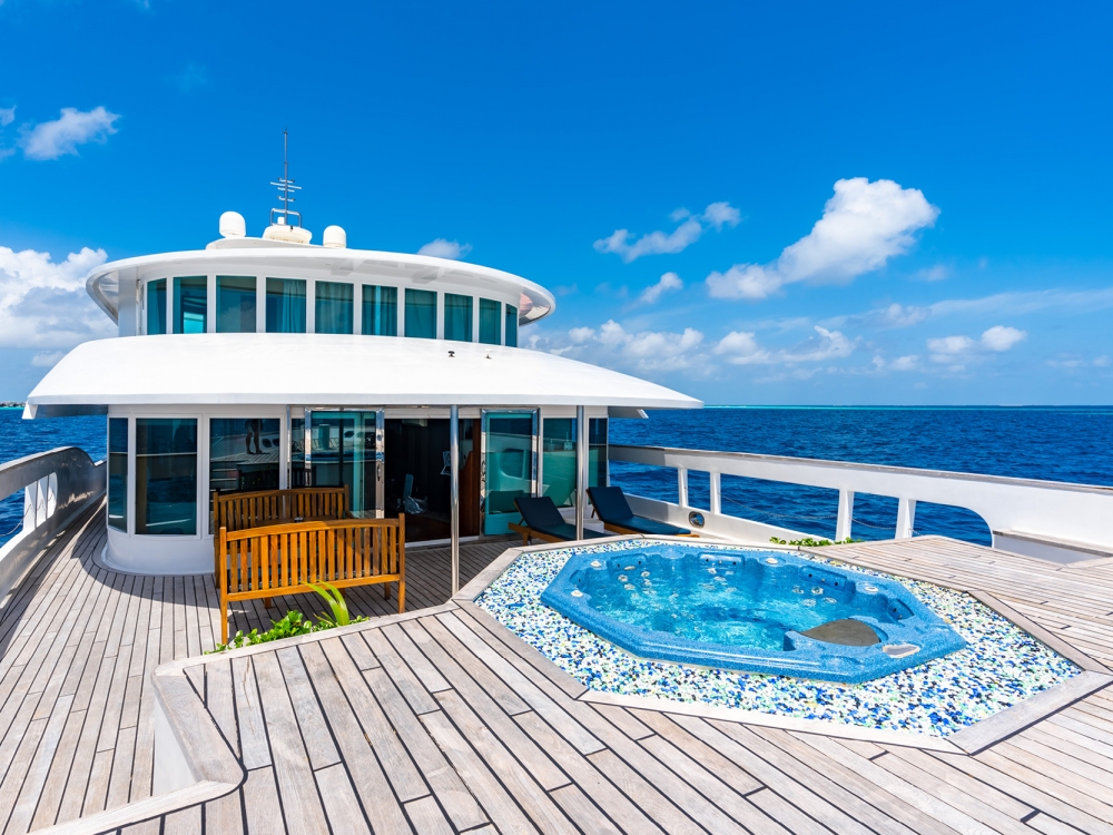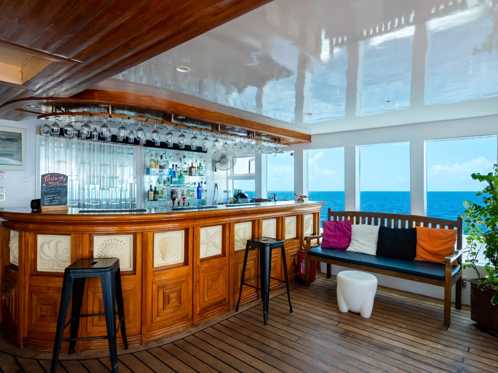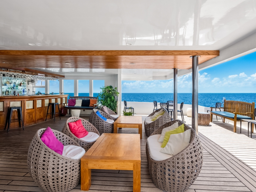 Les espaces communs sont conçus pour la détente et la convivialité. Le salon intérieur lumineux dispose d’un grand écran TV idéal pour visionner vos images sous-marines ou un film en soirée, tandis que le salon extérieur et son bar permettent de profiter de la vue et d’un rafraîchissement en toute tranquillité. Pour les amateurs de soleil, de vastes ponts solarium sont à disposition afin de savourer pleinement la douceur du climat maldivien.